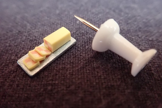 A sliced 1/24th scale Batternberg cake on a silver coloured cake board, for a half scale dolls house or tea room.