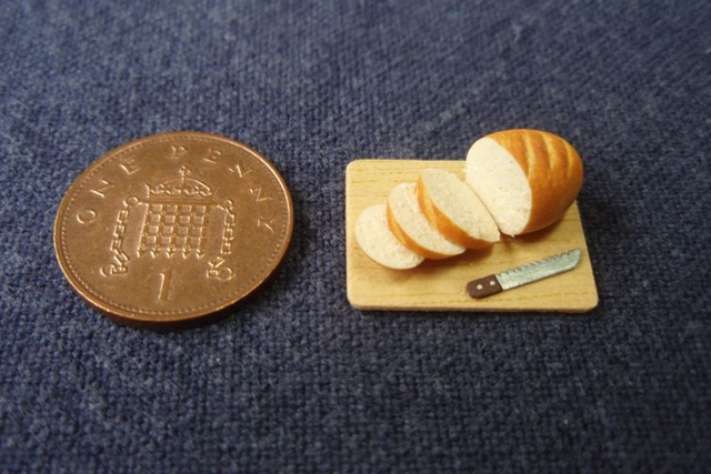 1/24th scale bloomer loaf on a wooden board with a bread knife. Very realistic breadlike texture!