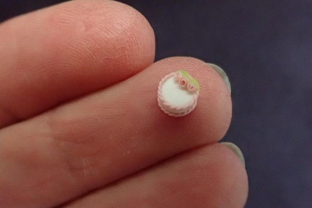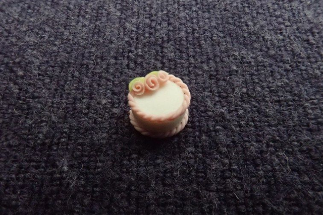 1/48th scale cake with white icing, decorated with pink edging and pink roses.
