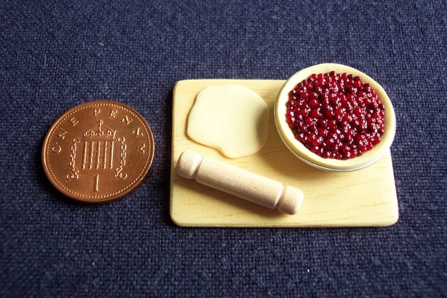 1/12th scale cherry pie in the process of being made - on a wooden preparation board with a rolling pin.