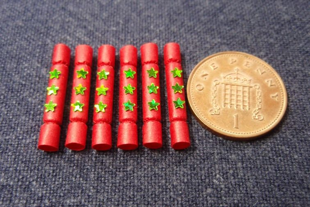 Six 1/12th scale Christmas Crackers, unboxed for your festive place settings! Choose from gold with red stars, or red with green stars.