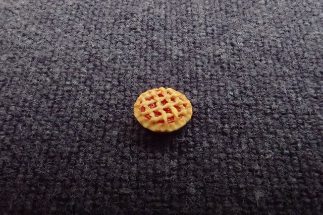 1/48th scale lattice topped pie in a dark blue pie dish, with a red fruit filling.