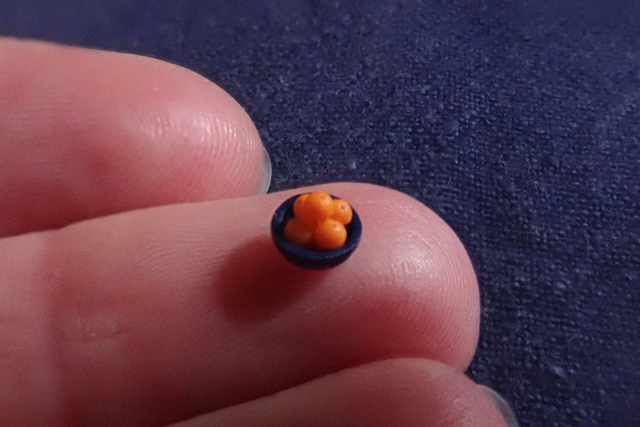 Tiny oranges in a dark blue fruit bowl, for a 1:48th scale (quarter scale) dolls house. Handmade by Suzy Riley of Life of Riley Miniatures. This item will usually be made to order.