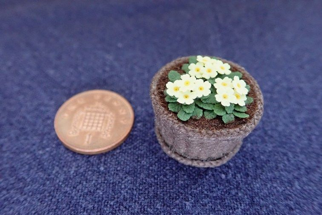 Three 1/12th scale cheerful spring primroses in a handmade wicker-effect basket. Choose from classic yellow or mixed colours!