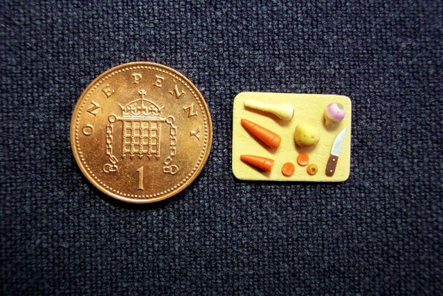 1/24th scale root vegetables (carrot, parsnip, potato and turnip) on a wooden chopping board with a knife. Very tiny and detailed!
