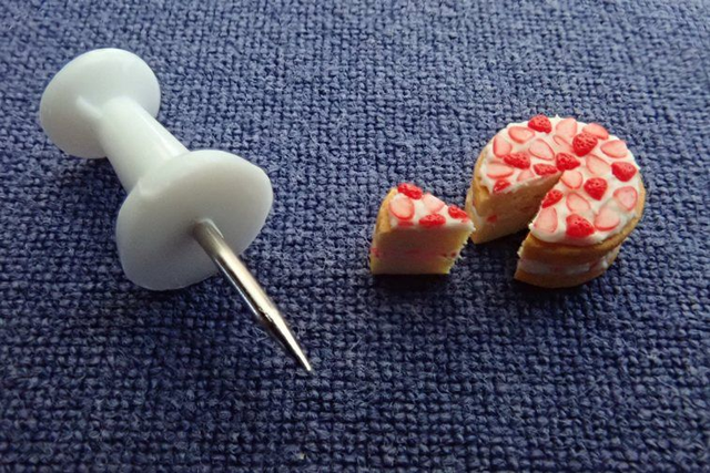 A yummy strawberry and cream sponge cake, with a slice cut out, for a 1/24th scale dolls house, bakery, or tea rooms.