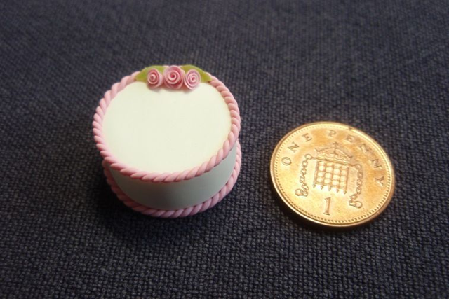 1/12th scale white iced round cake, with pink piping and roses to decorate.